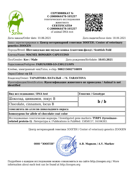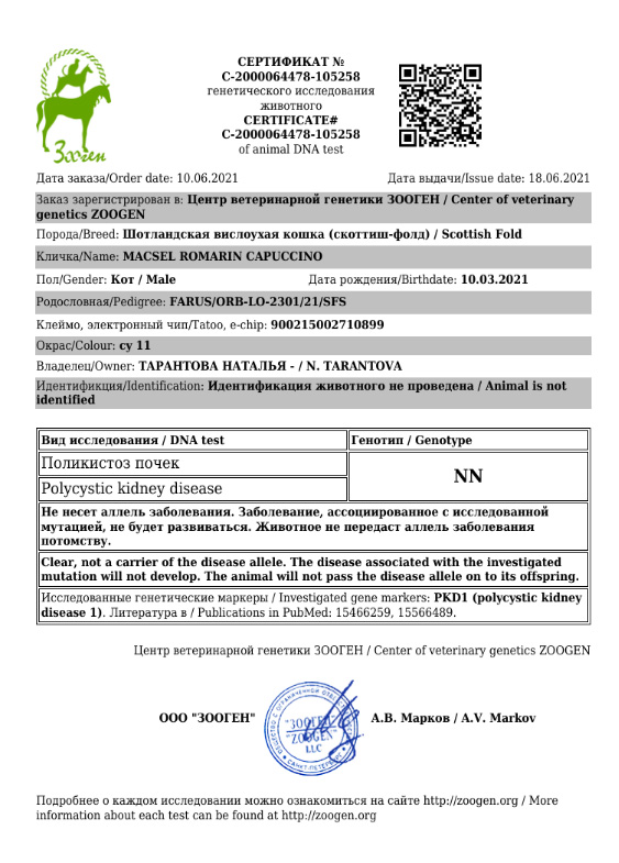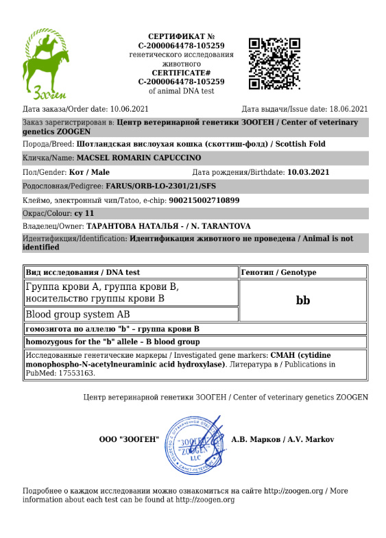 Заводчик: Романова И. Владелец: Тарантова Н.