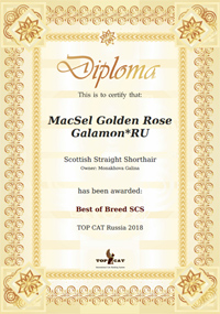 Gr.Eur Ch. MacSel Golden Rose Galamon*RU - лучший скоттиш страйт в России. Рейтинг учитывает все результаты всех выставок во всем мире за 2018 год.