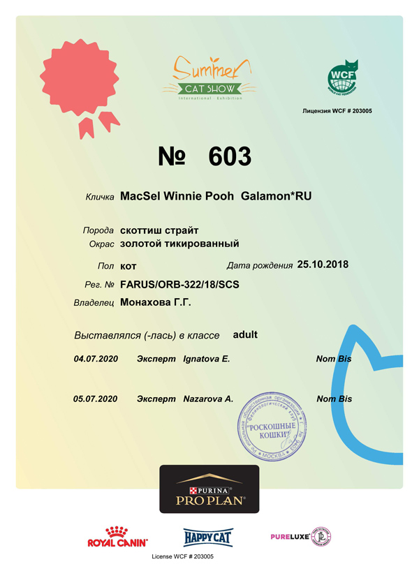 MacSel Winnie Pooh Galamon*RU великолепно выступил на большой международной выставке по системе WCF В Твери.